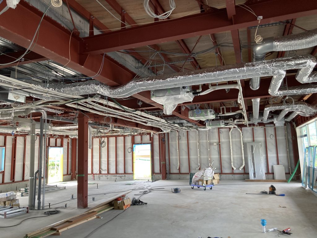 鉄骨建方工事、スラブのコンクリート打設が終わり、これから屋根工事・外壁工事へ進んでいきます。