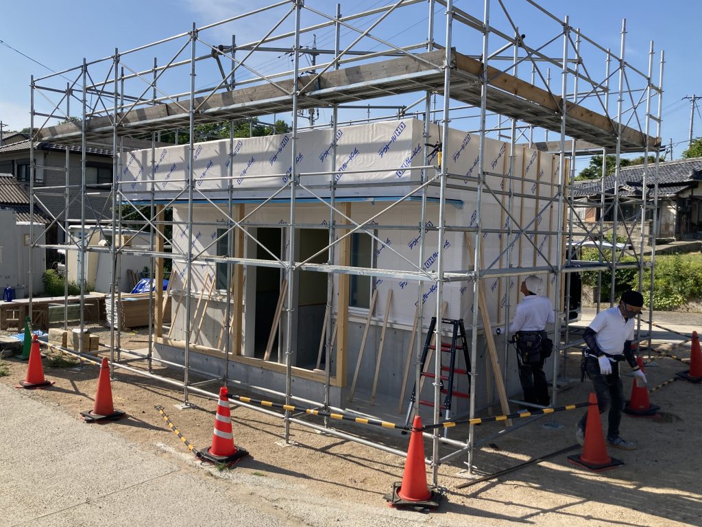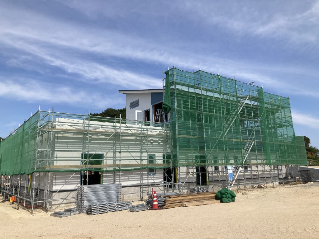 岡山県備前市日生町で施工中の里海の交番はただいま外装工事・設備配管工事まで進んでおります。