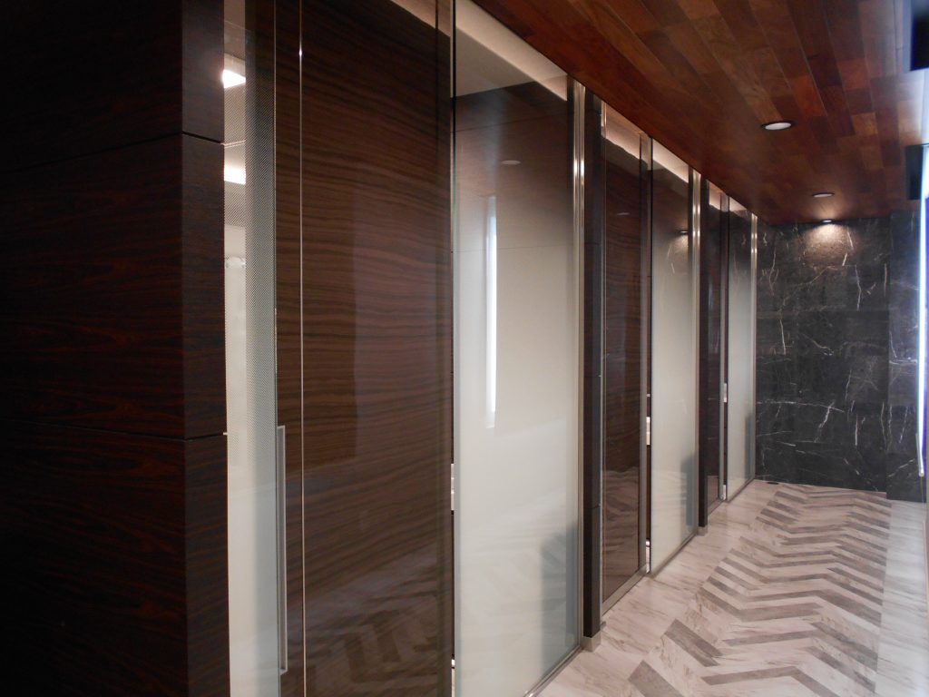 壁に大理石、天井にカリンフローリングを使用することで高級感を出しています。