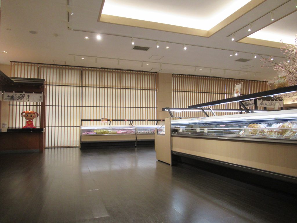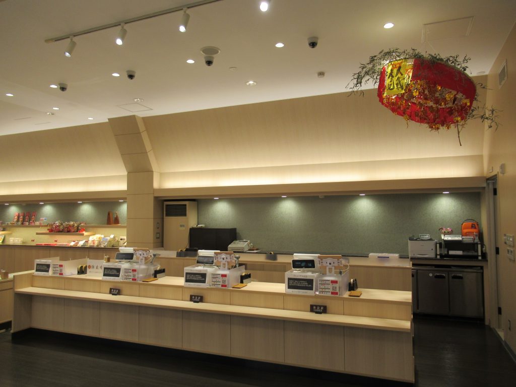 以前は陳列棚のレイアウトに合わせて屋台を組み、窓の光に照らされた明るい雰囲気の内装でしたが、今回は「和」をテーマに木目の統一感と間接照明で落ち着いた内装になりました。