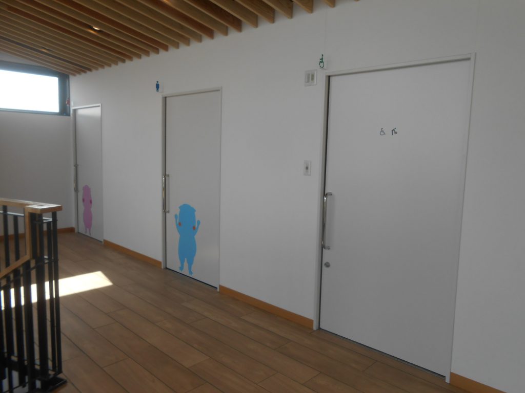 男性トイレのドアに「フクちゃん」、女性トイレのドアに「サキちゃん」のシルエットを貼ったり、