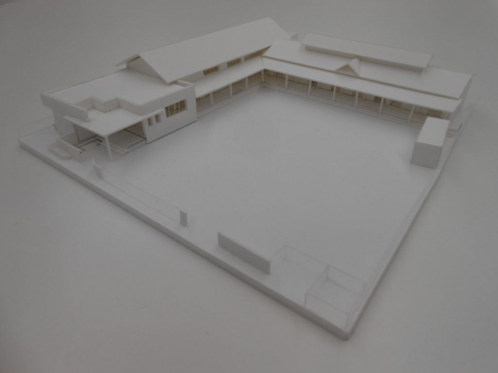 既存園舎の瓦屋根が残るので、いかに増築棟が調和できるかがポイントです。