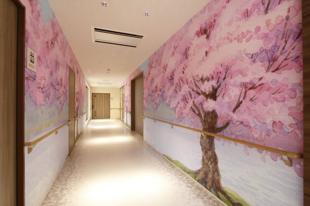 特注で桜をプリントしたクロスを貼り、桜並木を演出しました。床材も桜の花びらが散りばめられたデザインのものを選定しています。